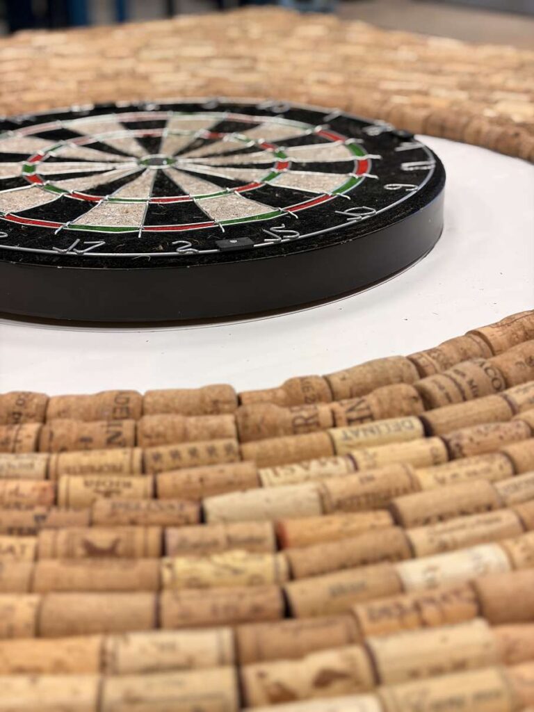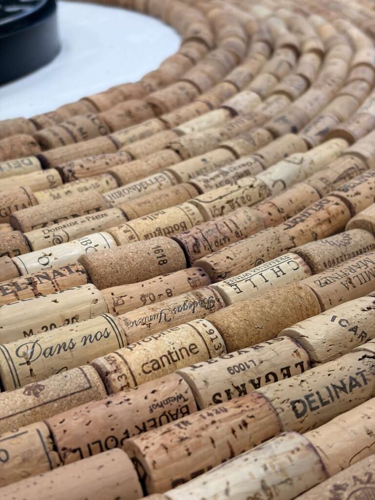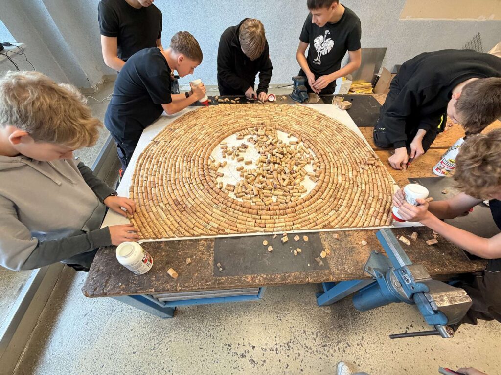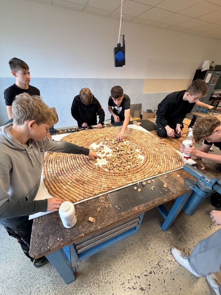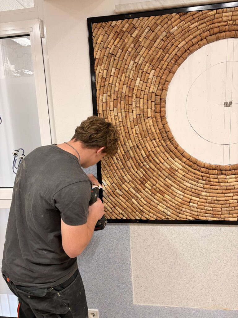 Mehr als 1.000 Korken aus Weinflaschen wurden gesammelt, zugeschnitten, angeschliffen und schließlich vollflächig verklebt, um eine einzigartige und nachhaltige Wandgestaltung zu schaffen. Das Projekt vereinte handwerkliches Geschick, Teamarbeit und Kreativität.