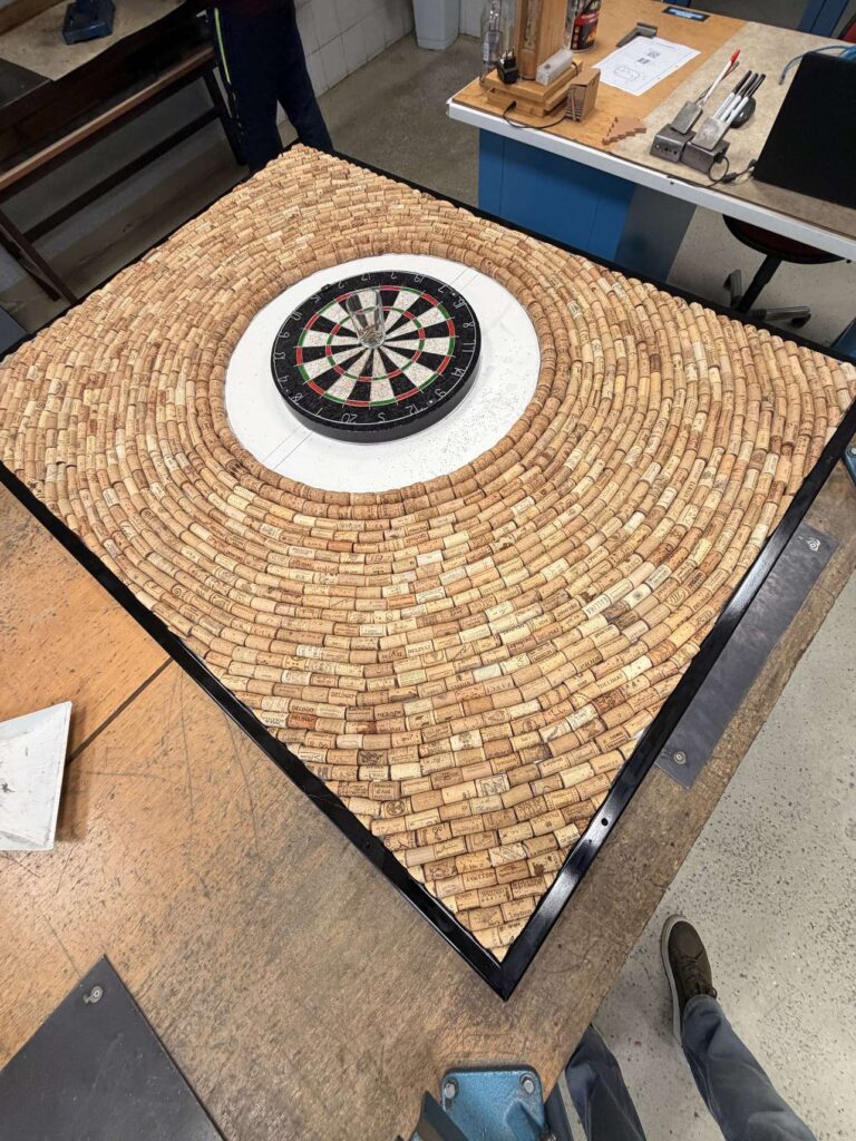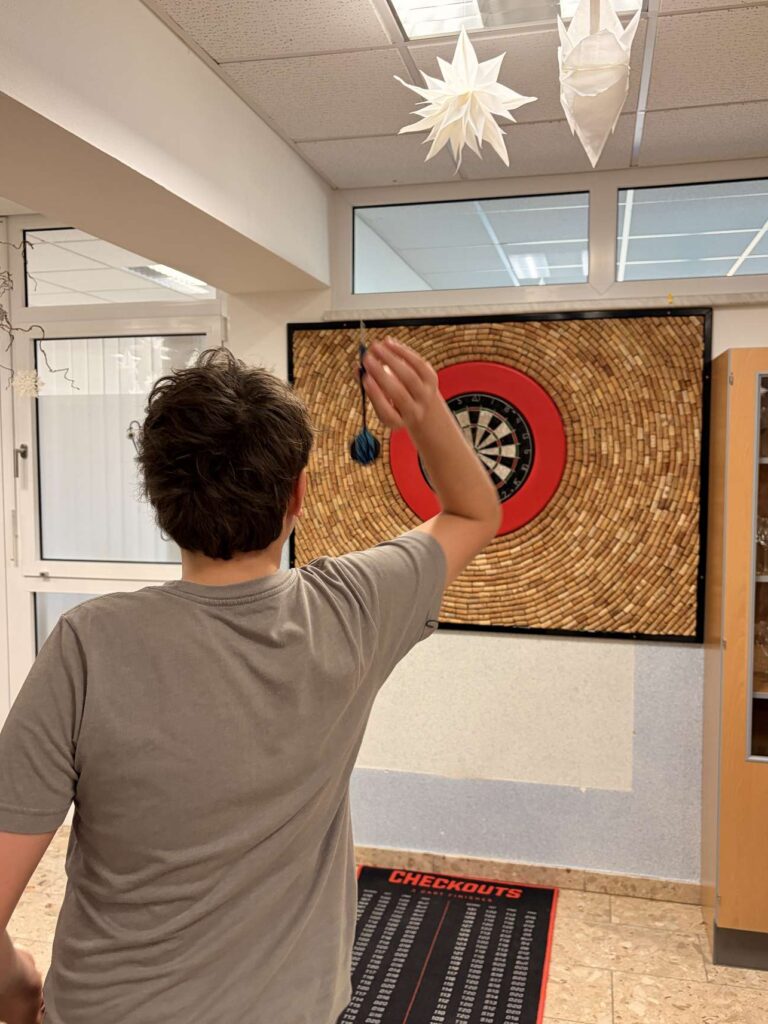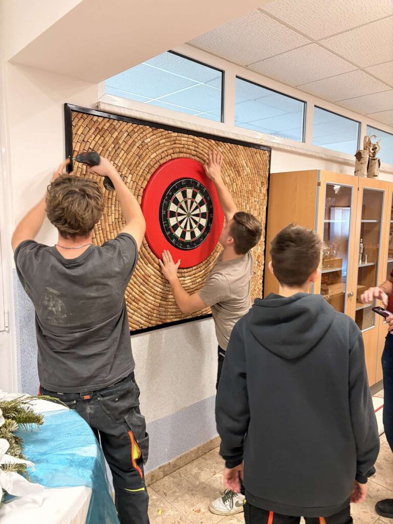 In den vergangenen zwei Wochen wurde das Dartboard in unserer Schule im Rahmen eines fachbereichsübergreifenden Projekts neu gestaltet. Dabei stand nicht die Dartscheibe selbst im Mittelpunkt, sondern die kreative und handwerkliche Überarbeitung des Bereichs rund um das Board.