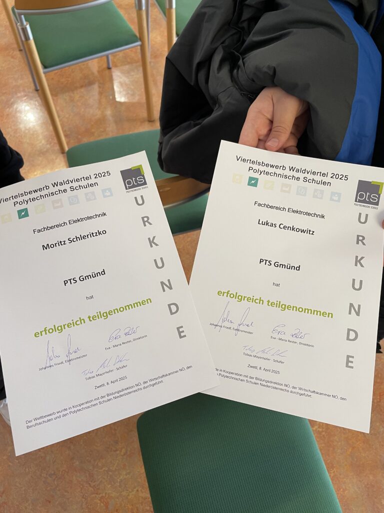 Beim Viertelsbewerb der Polytechnischen Schulen im Fachbereich Elektro, der kürzlich in Zwettl ausgetragen wurde, konnte die PTS Gmünd mit soliden Platzierungen überzeugen. Moritz Schleritzko und Lukas Cenkowitz erreichten in einem Teilnehmerfeld von rund 15 Schülern die sehr respektablen Plätze 5 und 9.